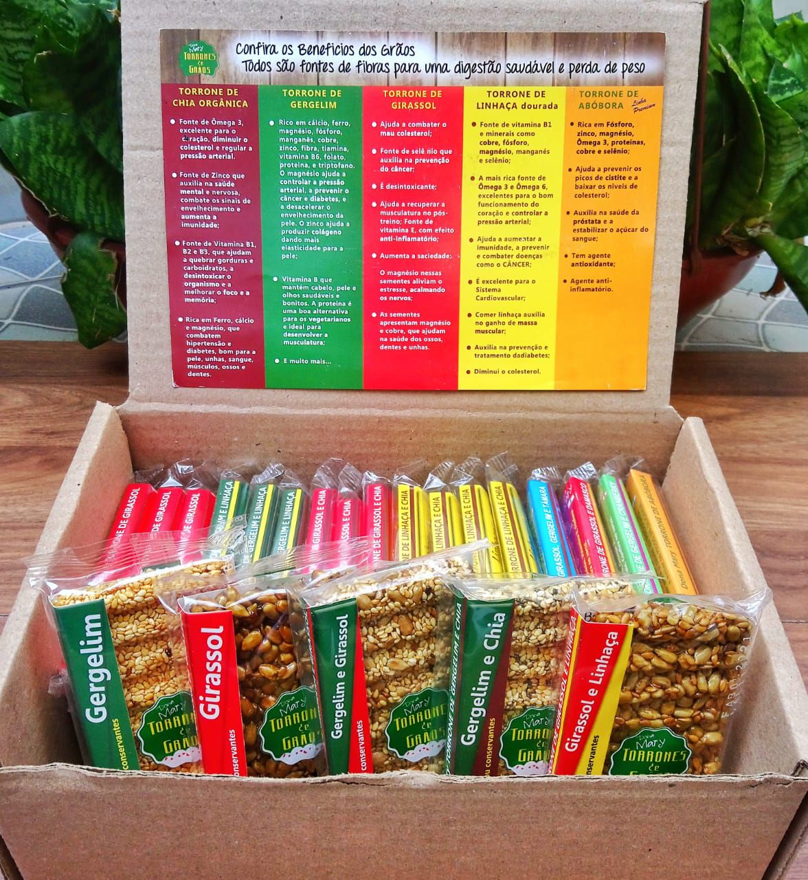 Seguindo a tradicional culinária Sírio-libanesa, a equipe Dona Mary desenvolveu uma receita com as sementes mais benéficas sugeridas pela maioria dos nutricionistas quando o assunto é ter uma alimentação saudável. Nossos torrones são carinhosamente manipulados com grãos nobres como Gergelim, Girassol, Linhaça Dourada, Chia & Abóbora. Combinados com mel e demerara. A combinação perfeita entre o prático, saudável e saboroso!